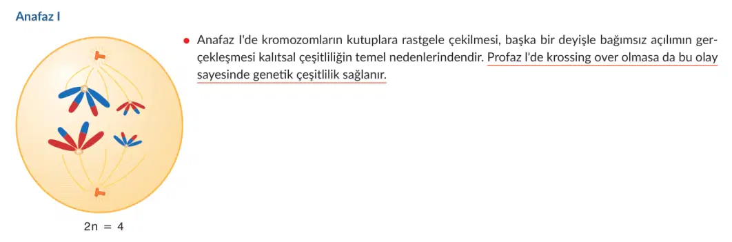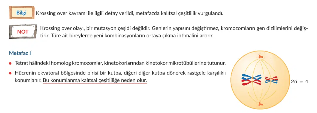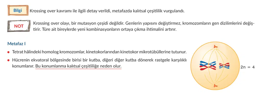 Krossing over detaylandırıldı ve metafaz 1 , anafaz 1 evresindeki kalıtsal çeşitlilik vurgulandı. Kalıtsal çeşitlilik Profaz 1 , Metafaz 1 , Anafaz 1 de sağlanır. Ama en fazla krossing over Profaz 1 de görüldüğü için Profaz 1 evresindedir.